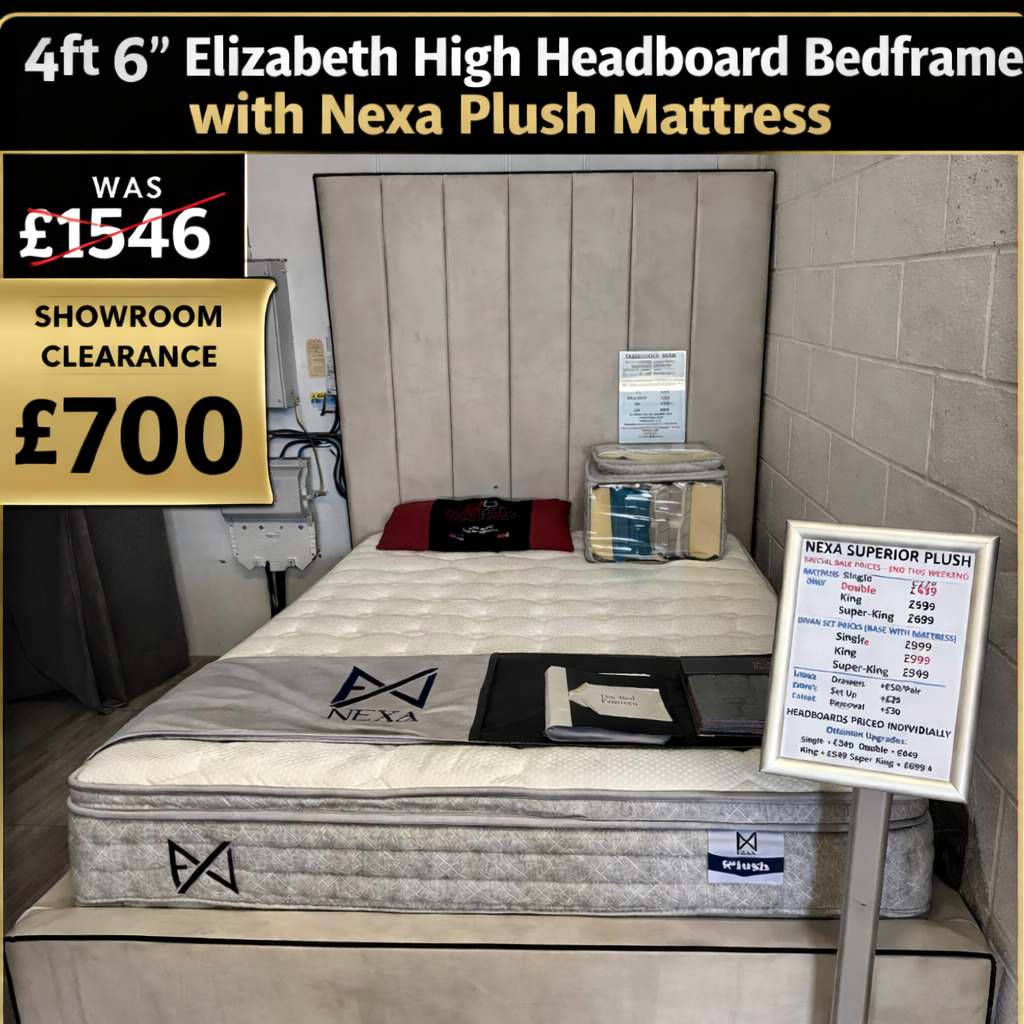 Beds › 4ft 6" Elizabeth High Headboard Bedframe with Nexa Plush Mattress Image 1 of 1 4ft 6" Elizabeth High Headboard Bedframe with Nexa Plush Mattress Sale Price: £700.00 Original Price: £1,546.00 Price includes Mattress, Base and HeadboardNext Day delivery Available(Please check access before buying) Add To Cart Added! Price includes Mattress, Base and HeadboardNext Day delivery Available(Please check access before buying) You Might Also Like 4ft 6" Cashmere Divan Set and London Headboard Sale Price: £430.00 Original Price: £678.00 Sale 3ft Special Memory Divan Set with Headboard Sale Price: £295.00 Original Price: £398.00 Sale 5ft Cloud 3000 Full Foam Divan Set and Surose Headboard Sale Price: £650.00 Original Price: £1,168.00 Sale 5ft Lyon Divan Set and Aries Headboard Sale Price: £450.00 Original Price: £668.00 Sale 4ft 6" Emerald Side Opening Ottoman Set with Flutted Floorstanding Headboard Sale Price: £675.00 Original Price: £948.00 Sale