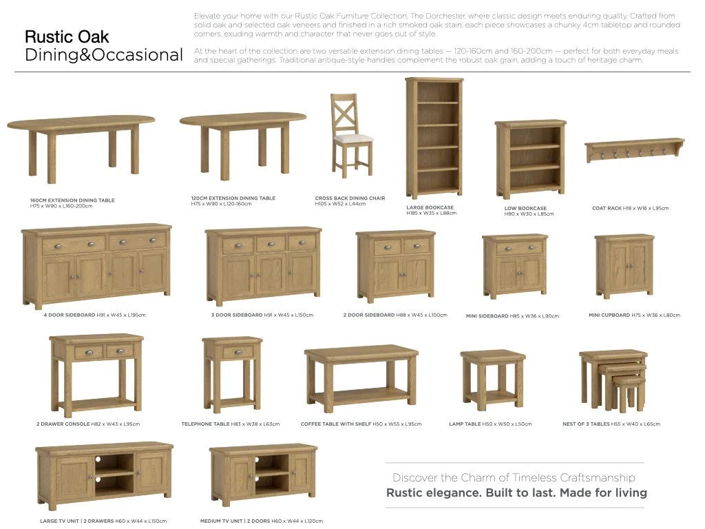 Elevate your home with our Rustic Oak Furniture Collection, The Dorchester, where classic design meets enduring quality. Crafted from solid oak and finished in a rich smoked oak stain, each piece showcases a chunky tabletop and rounded corners, exuding warmth and character that never goes out of style.