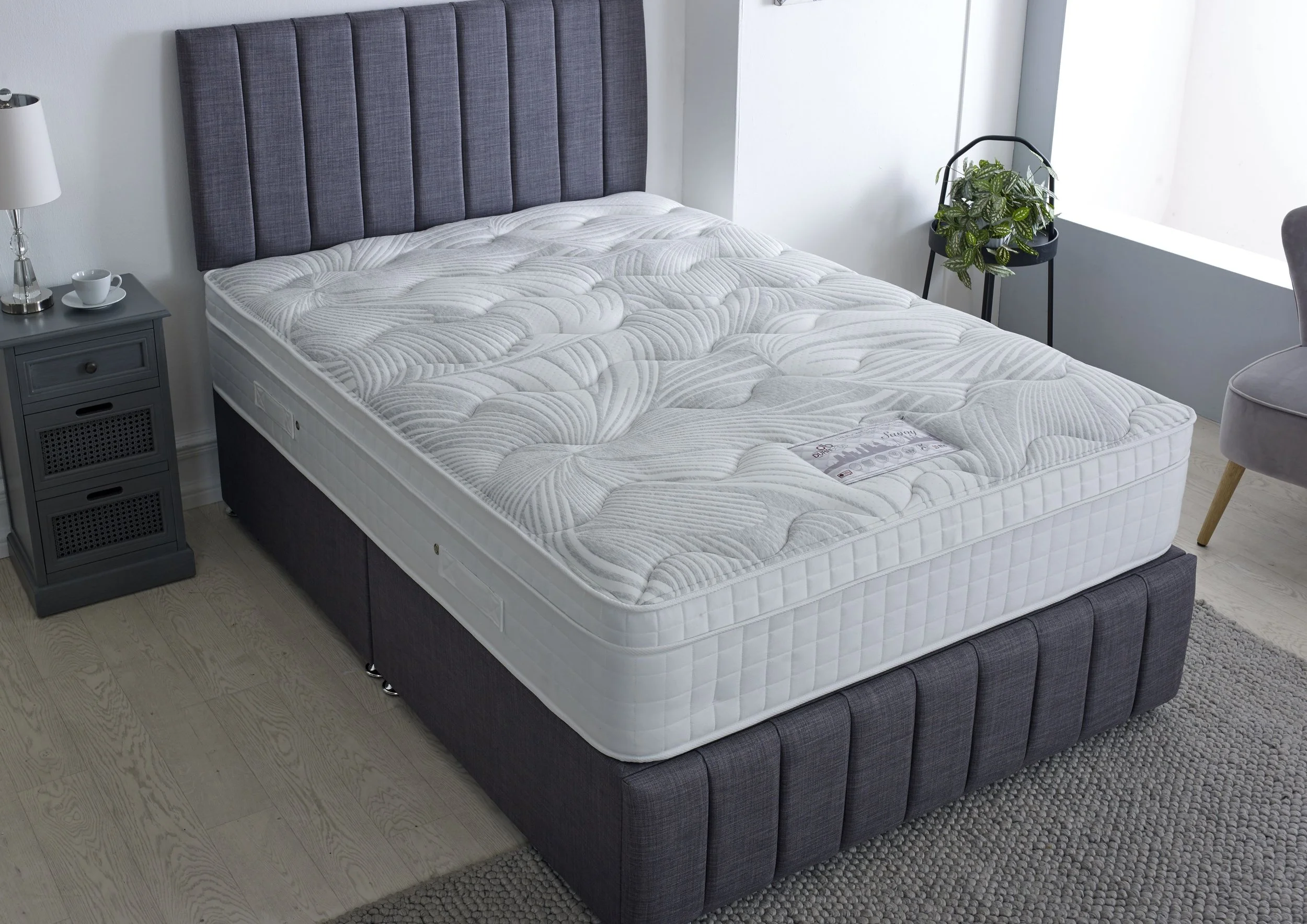1000 Pocket Spring Unit. Microquilted. High Loft with Deluxe Cushion Top. Upholstered in a Deep Sculptured Knitted Fabric. MicroQuilted Mattress and Base - No Turn.