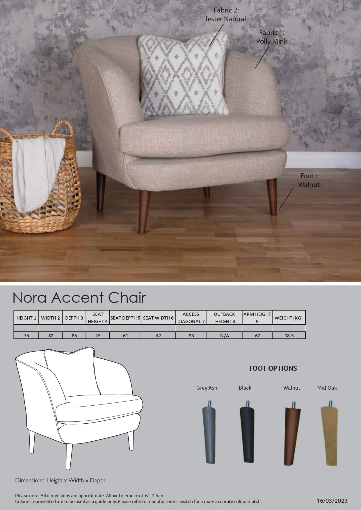 Sofas › Nora Accent Chair Image 1 of 1 Nora Accent Chair Sale Price: £499.00 Original Price: £699.00 Further Colour Options/Feet Option Can be added on the additional information form at check out Colour: Custom Made Buy it as shown in Picture Add To Cart Added! Further Colour Options/Feet Option Can be added on the additional information form at check out You Might Also Like Danbury Sofa Range from £599.00 Sale Finley Wing Accent Chair Sale Price: £699.00 Original Price: £899.00 Sale Lucas Swivel Accent Chair Sale Price: £799.00 Original Price: £999.00 Sale Atlantis Sofa Range from £399.00 Sale Arc Round Footstool Sale Price: £399.00 Original Price: £499.00 Sale