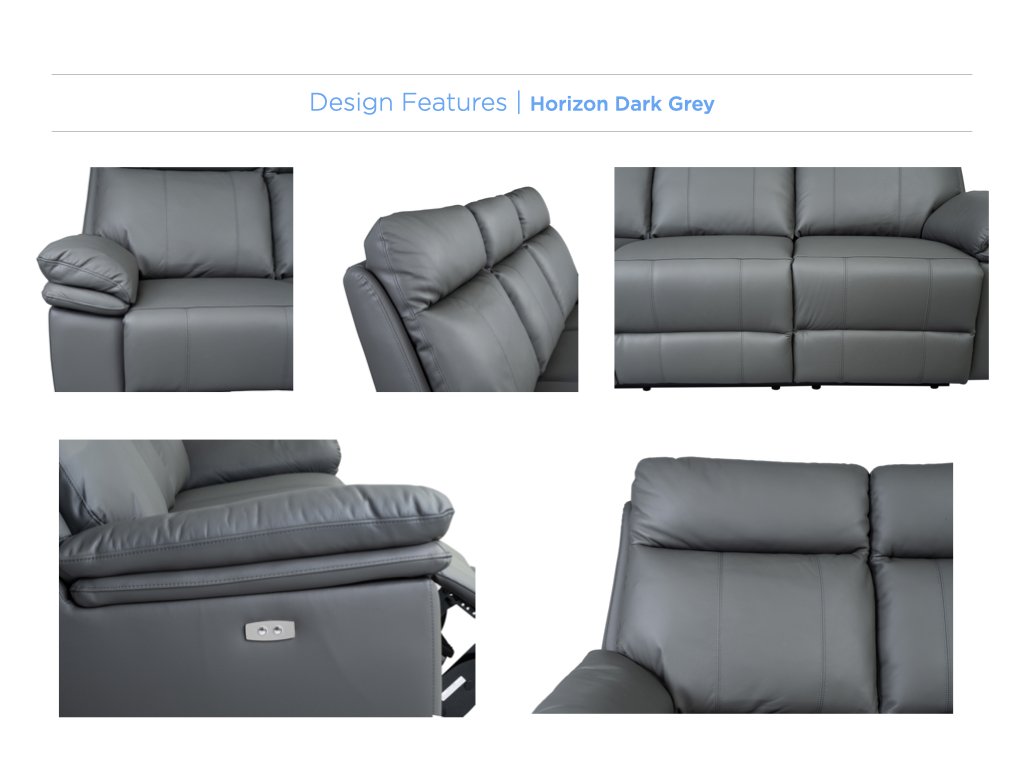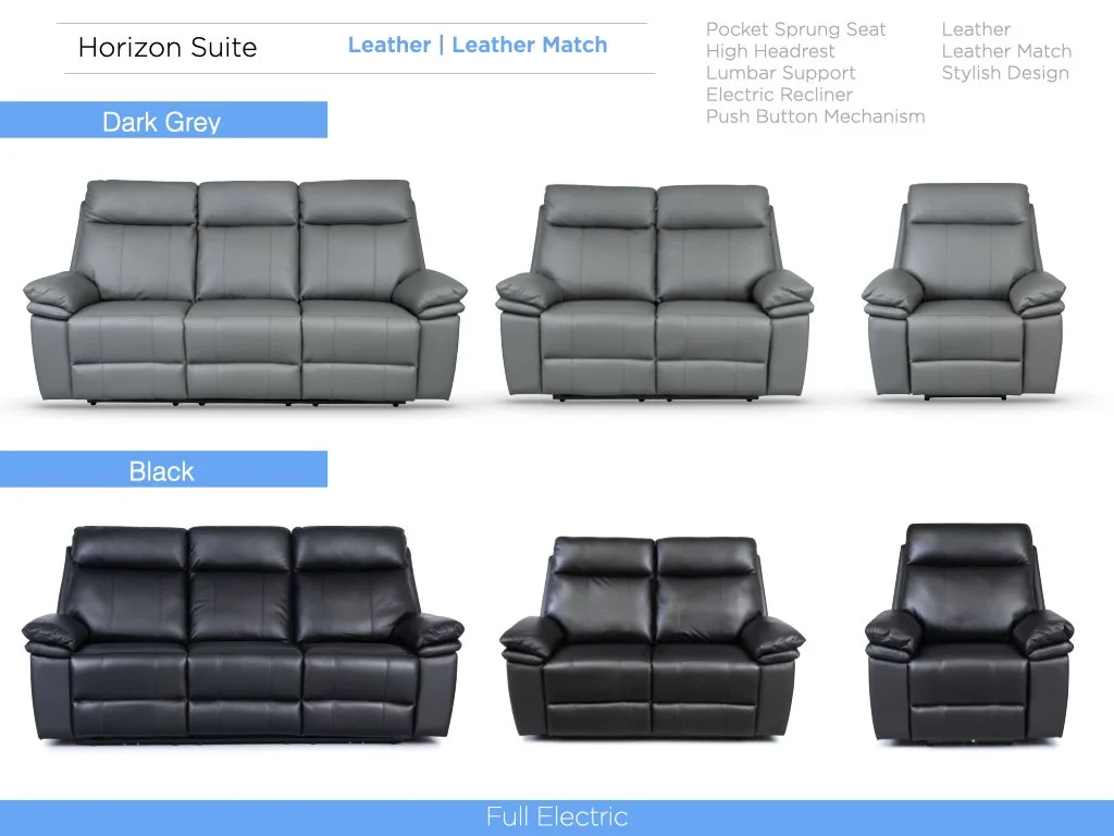 Experience the perfect combination of luxury and modern design with our Electric Reclining Suite, available in premium full leather and leather match upholstery, in sleek Dark Grey and Black. This suite offers the ultimate in comfort, with smooth electric reclining mechanisms that allow you to effortlessly adjust to your ideal lounging position at the touch of a button. The rich leather finish adds sophistication and durability, making it a timeless addition to any living space. The Horizon Suite delivers elegance, comfort, and convenience in every detail.