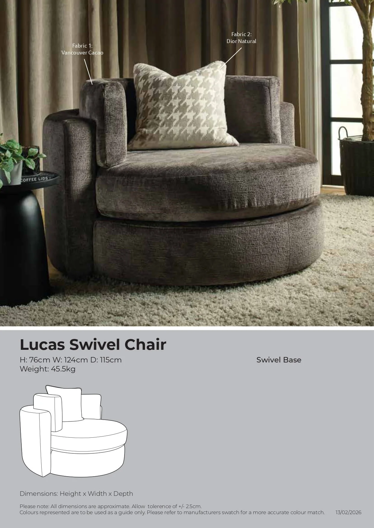 Sofas › Lucas Swivel Accent Chair Image 1 of 1 Lucas Swivel Accent Chair Sale Price: £799.00 Original Price: £999.00 Further Colour Options/Feet Option Can be added on the additional information form at check out Colour: Custom Made Buy it as shown in Picture Add To Cart Added! Further Colour Options/Feet Option Can be added on the additional information form at check out You Might Also Like Gemini Power Reclining Sofa Range from £799.00 Sale Chicago Sofa Range from £449.00 Sale Evie Sofa Range from £399.00 Sale Danbury Sofa Range from £599.00 Sale Vesper Sofa Range from £749.00 Sale